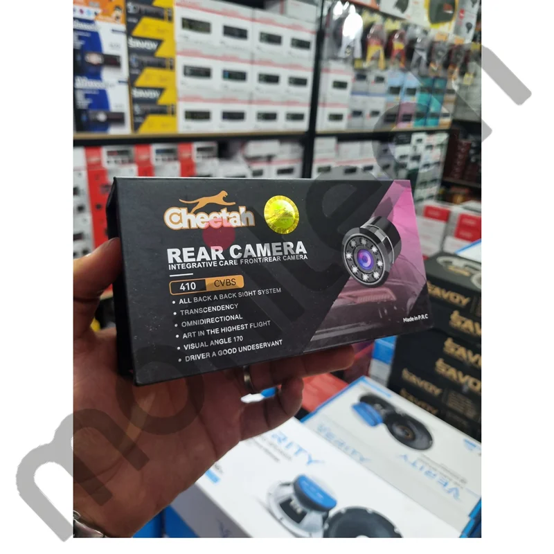 دوربین دنده عقب چیتا مدل ۴۱۰ CVBS – طراحی چشم‌ماهی جمع‌وجور با زاویه دید حدود ۱۴۰ درجه، خروجی CVBS ساده و نصب زیر پلاک یا سپر آسان. بدنه مقاوم، دید رنگی واضح و مناسب برای پارک مطمئن در شب و روز است .